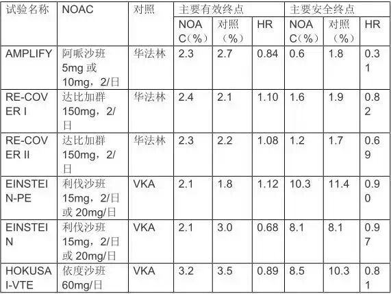 主要的针对不同新型口服抗凝药治疗静脉血栓栓塞的 III 期临床试验如下表所示,这些研究设计类似,均为新型口服抗凝药和华法林的非劣性比较试验,随访时间 3 个月至 1 年不等,研究主要安全终点往往为非致命静脉血栓栓塞复发或静脉血栓栓塞相关死亡,而主要安全终点统一采用国际血栓和止血协会设定的标准。