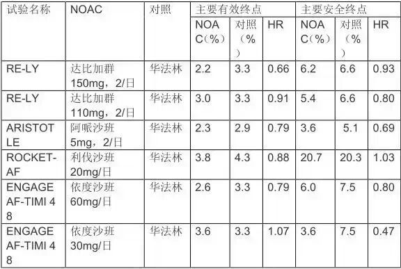 表一:房颤患者中比较新型口服抗凝药和华法林的大型临床试验