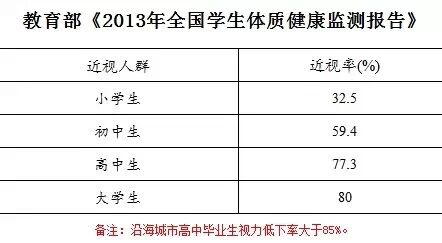 教育部《2013年全国学生体质健康监测报告》显示近年来小学生近视率32.5%; 初中生59.4%;高中生77.3%;大学生80%; 沿海城市高中毕业生视力低下率85%,高度近视率呈急剧上升趋势。