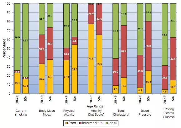 图2 根据2011年到2012年的全国健康和营养调查,到2020年美国≥20岁成人心血管健康状况7指标未调整的估计值(差、良、优)