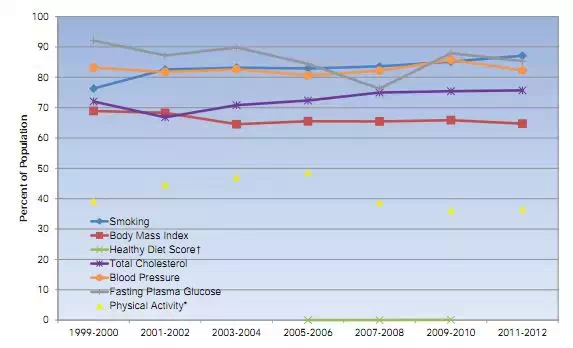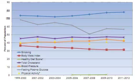 图4 美国≥20岁成人理想心血管健康7指标达标率变化趋势
