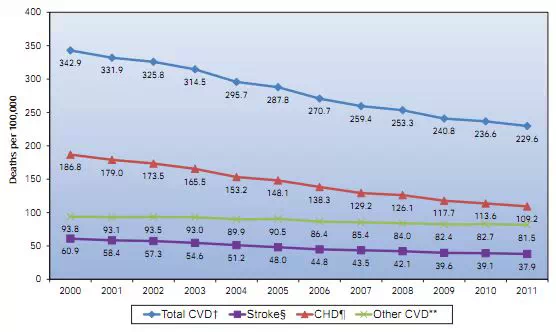 2014年12月17日,《Circulation》杂志发表了美国心脏协会(AHA)对心脏病和卒中的数据统计更新,并首次对全球其他国家的心脏病和卒中数据进行了概述。在世界范围内,心血管疾病仍然是死亡的主要原因,每年夺去1730万人的生命。心血管疾病不再是西方世界的疾病,全球低、中收入国家中80%的死亡是由心血管疾病引起的。好消息是从2001年到2011年心血管疾病死亡率下降了40%。
