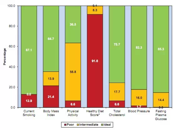 图1 根据2011年到2012年的全国健康和营养调查(NHANES),到2020年美国12-19岁儿童心血管健康状况7指标未调整的估计值(差、良、优)