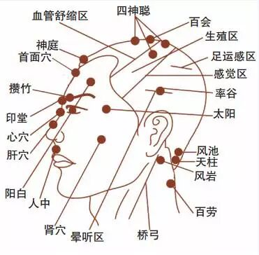 头穴:晕听区、感觉区、足运感区、生殖区、血管舒缩区等。