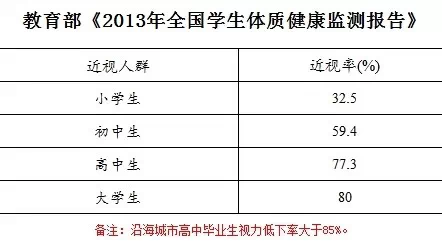 教育部《2013年全国学生体质健康监测报告》显示近年来小学生近视率32.5%; 初中生59.4%;高中生77.3%;大学生80%; 沿海城市高中毕业生视力低下率85%,高度近视率呈急剧上升趋势。