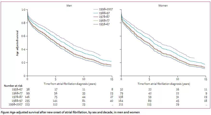 虽然大多数危险因素的流行随着时间发生了变化,但房颤相关的危险变化不大。多变量调整的比例风险模型显示,房颤发生后20年间,卒中减少了74%(95%Cl 50-86%)[1958-1967 vs. 1998-2007,HR 3.77,95%Cl 1.98-7.20,ptrend=0.0001],死亡率降低了25%(95%Cl -3-46%)[1958-1967 vs. 1998-2007,HR 1.34,95%Cl 0.97-1.86,ptrend=0.003]。