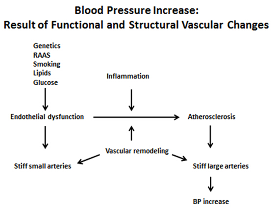 为了找到更为合理的血压检测方式或确定降血压治疗的真正目标,我们有必要了解一下高血压的一些背景知识。从上图我们可以看出,“血压升高”现象实际上是由于血管重塑及动脉僵硬化等累积效应所引起的。血管病变先于高血压,而高血压进一步恶化了血管病变。那么在诊断过程中,我们需要鉴别诊断血管异常(及后续高血压)患者与心功能存在问题的患者,前者才需要“高血压”治疗。此时降血压治疗需减慢或逆转心血管病变,而不是仅仅降低血压。